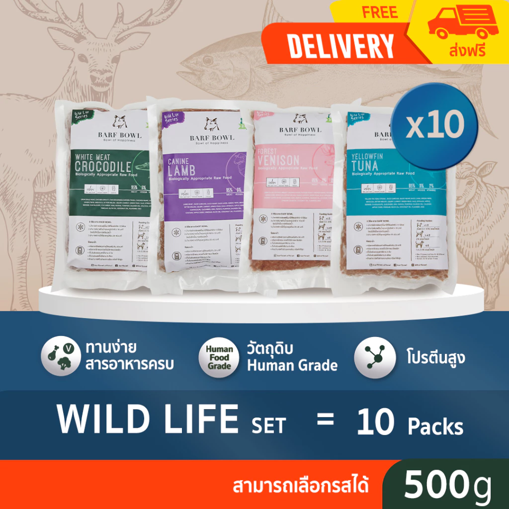 แนะนำ อาหารบาร์ฟสุนัข BARF สูตร Wild Life Series 500g x 10 ขิ้น เป็นสูตรสำหรับสุนัขที่ต้องการความหลากหลายของโปรตีน สูตรWild Life Series ได้นำเนื้อสัตว์สุดแรร์ที่มีแหล่งอาศัยอยู่ในป่าควบคู่กับเครื่องในเป็ดรวม ผัก ผลไม้ และวิตามินต่างๆ รวมอยู่มื้อเดียวกัน ทำให้ช่วยบำรุงร่างกายสุนัขได้เป็นอย่างดี